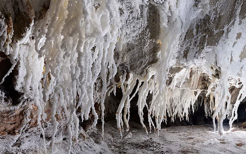 The walls of Namakdan Cave, covered in shimmering white salt crystals, offer breathtaking views for visitors. The cave’s stunning salt stalactites and stalagmites, combined with the light-reflecting properties of the salt crystals, provide an unforgettable natural experience.