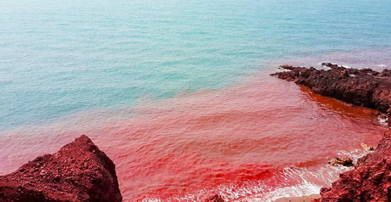 خاک این ساحل به دلیل اکسید آهن فراوان، به رنگ قرمز درخشان است. حتی آب دریا در این منطقه نیز به رنگ صورتی یا قرمز در میآید. خاک سرخ هرمز نه تنها زیباست، بلکه مصارف خوراکی (در ادویه سوراغ) و صنعتی نیز دارد. با این حال، برداشت خاک در سال ۲۰۲۶ به شدت ممنوع شده است.